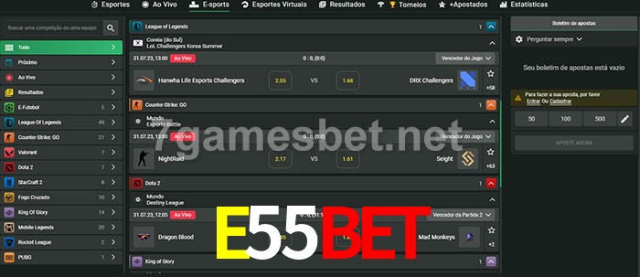 O E55Bet oferece uma grande seleção de opções de apostas em e-sports com probabilidades competitivas